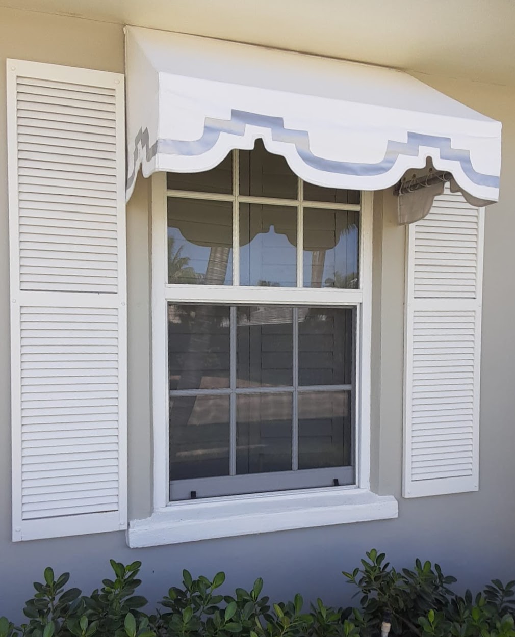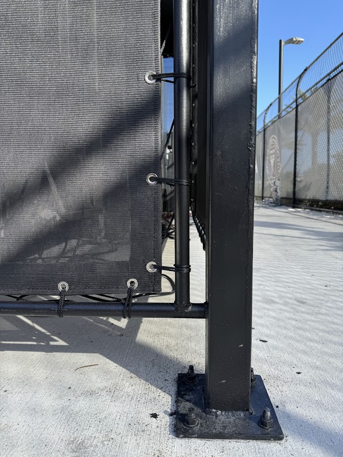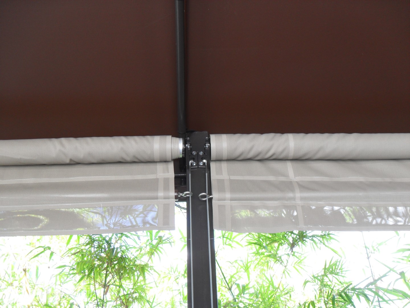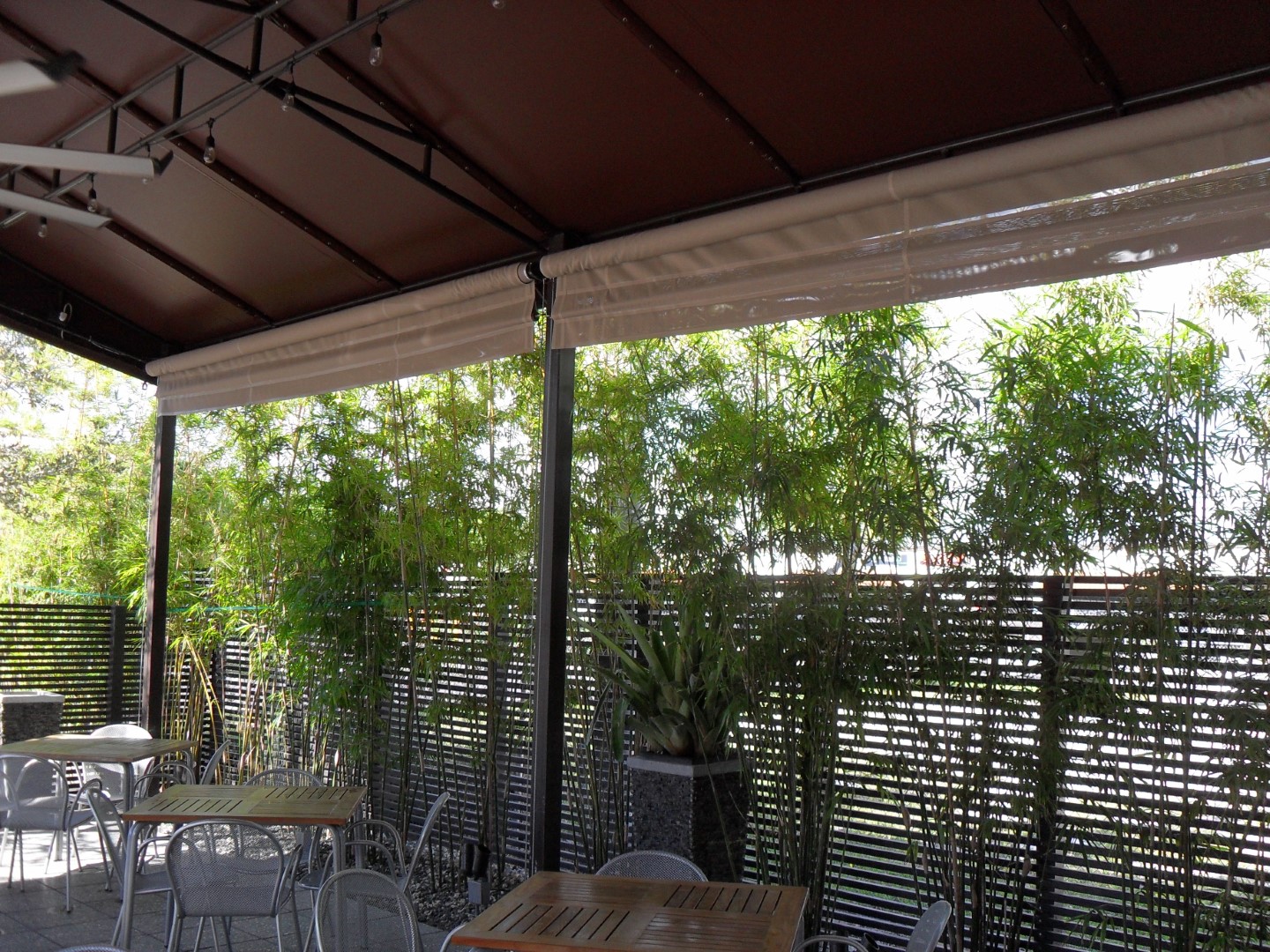 Adding a vertical shade system to a fixed frame awning is a great way to add privacy and additional shade. Shade fabrics are similar to awning fabrics but with spacing in the weave to let air and light through. We can select the right fabric for the level of transparency you would like. Shade systems come in a variety of options, from fixed in place panels, to simple classic roll up shades, manual crank, and electronic motors with remote controls.