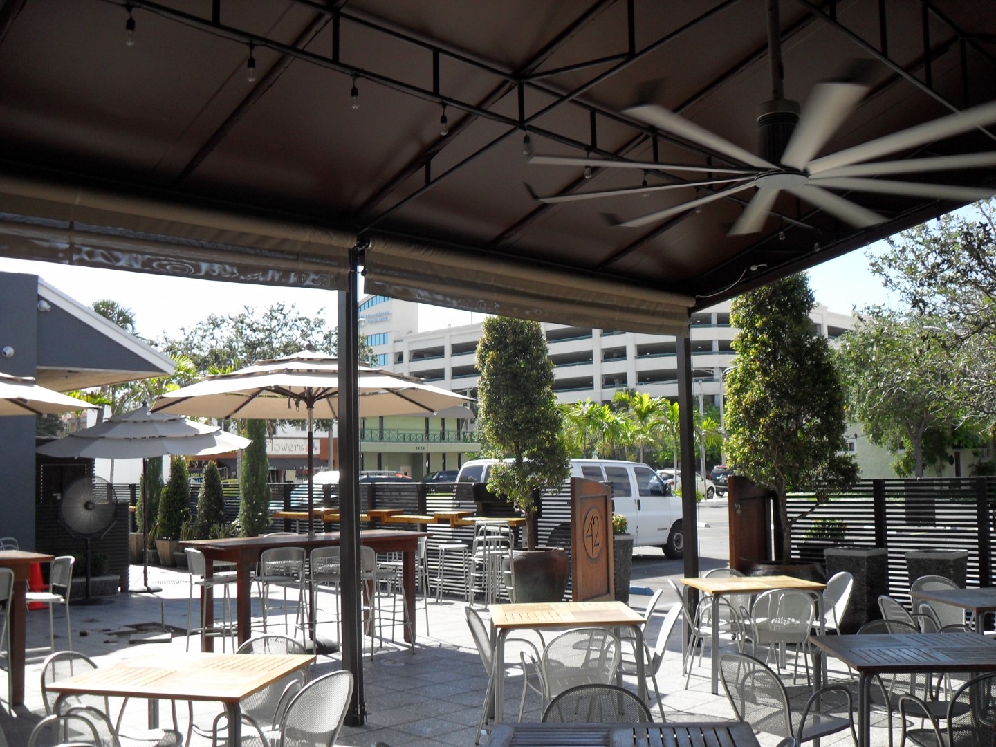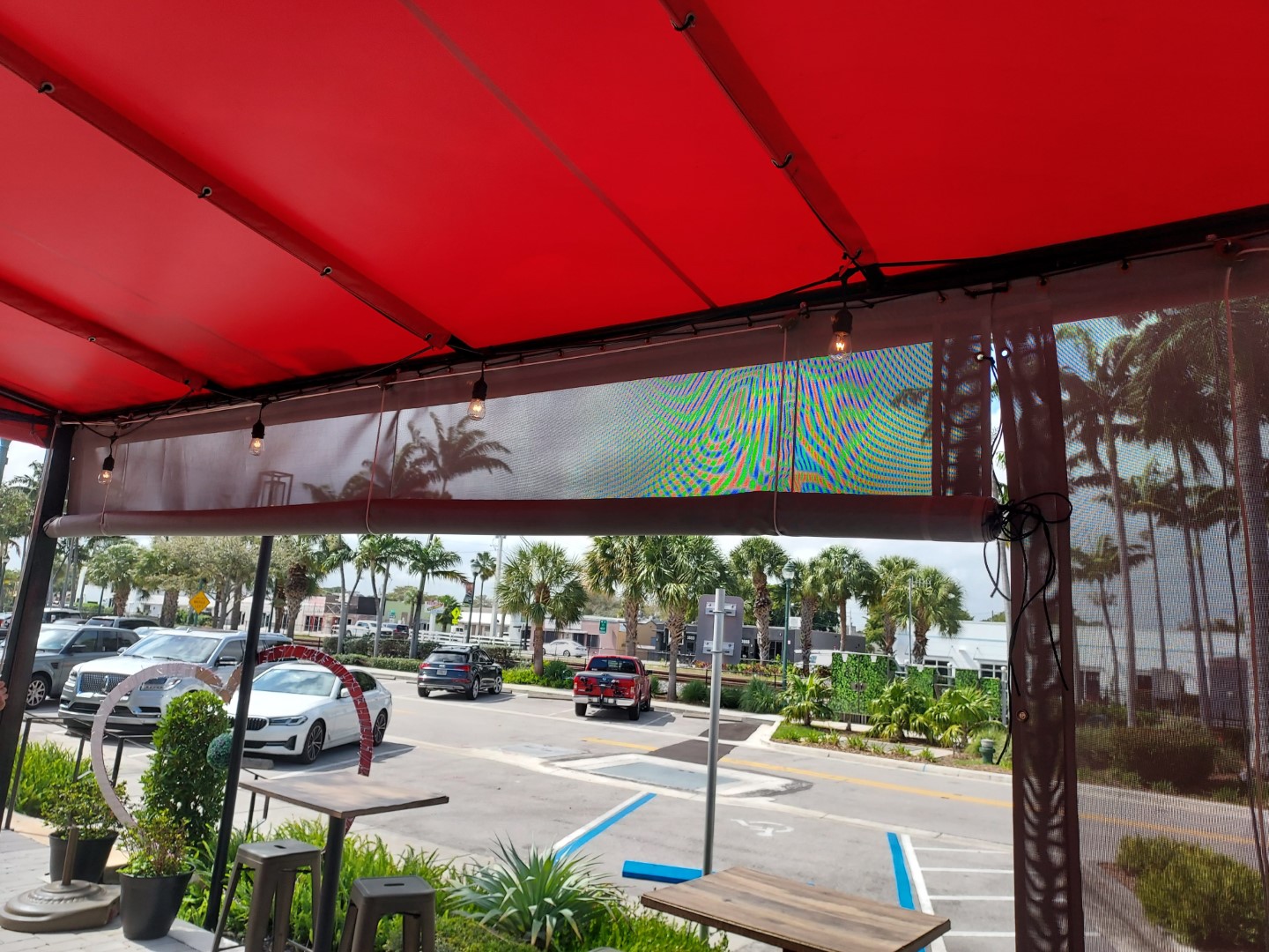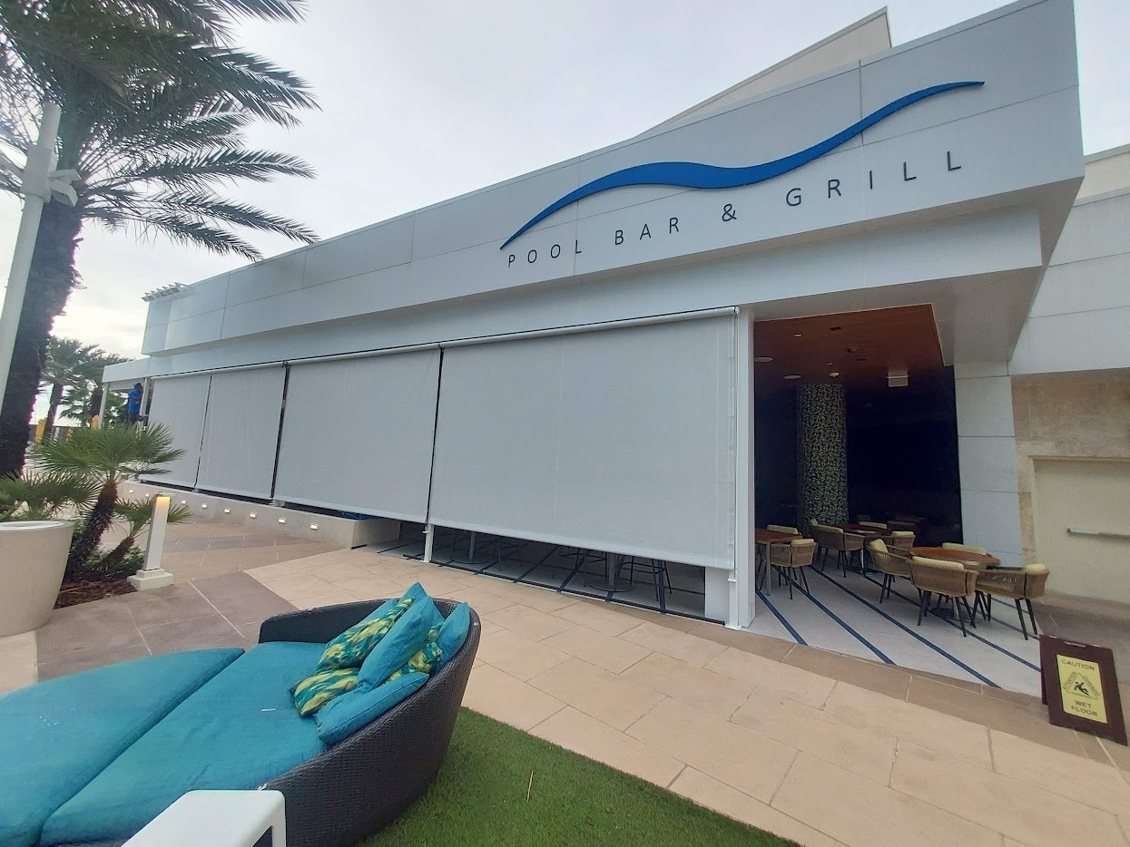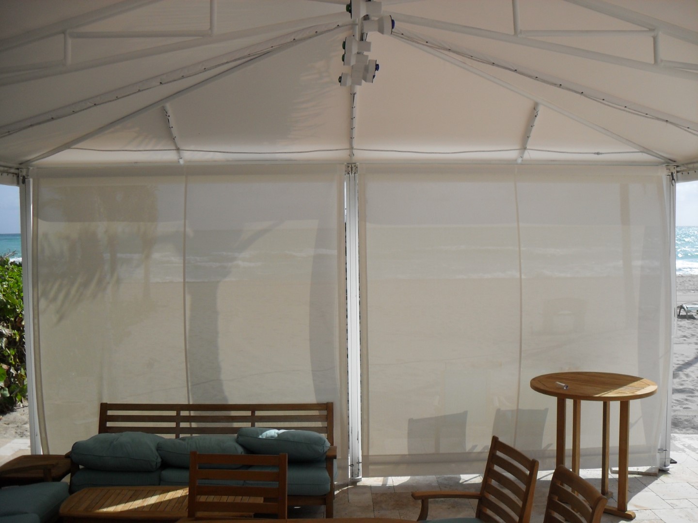 Adding a vertical shade system to a fixed frame awning is a great way to add privacy and additional shade. Shade fabrics are similar to awning fabrics but with spacing in the weave to let air and light through. We can select the right fabric for the level of transparency you would like. Shade systems come in a variety of options, from fixed in place panels, to simple classic roll up shades, manual crank, and electronic motors with remote controls.